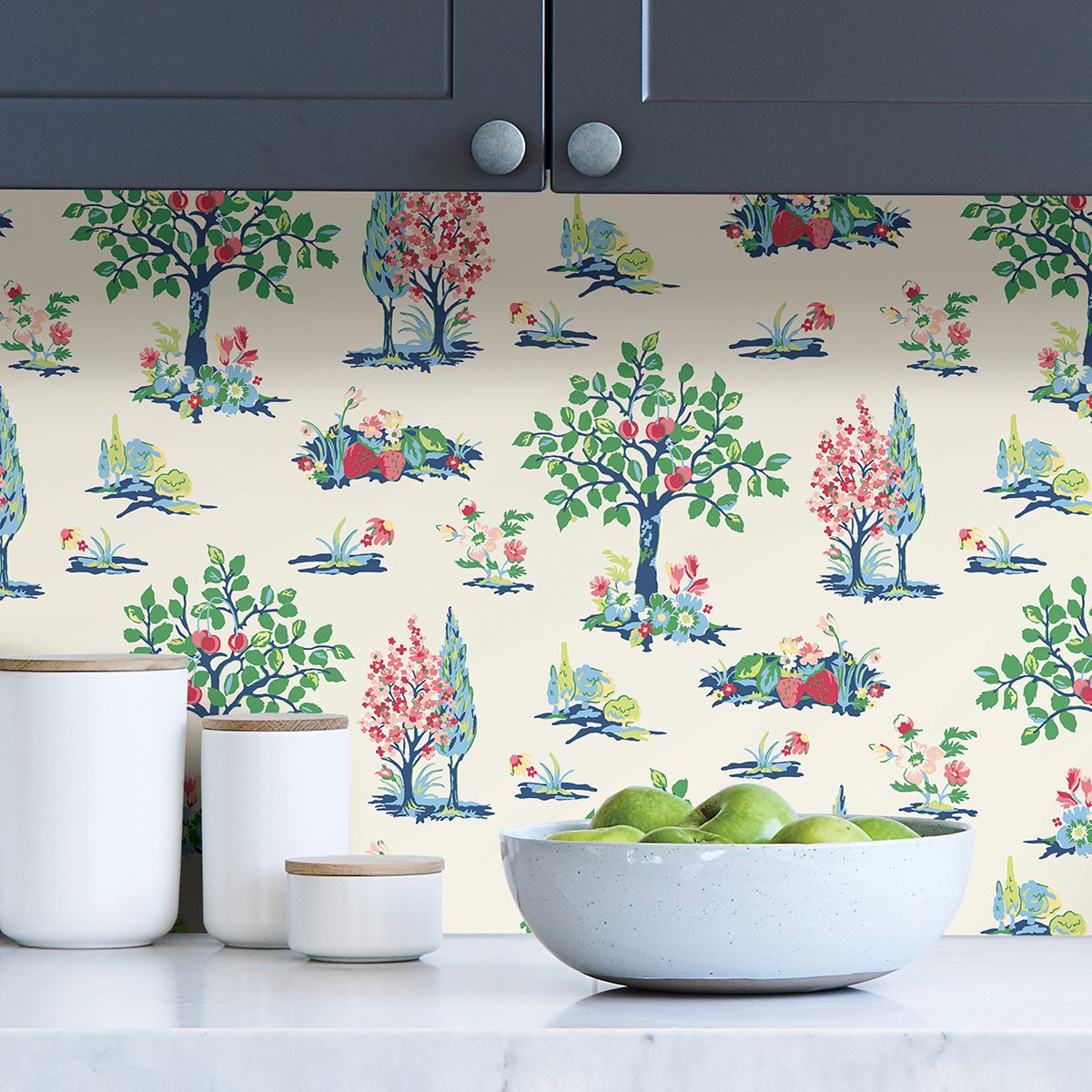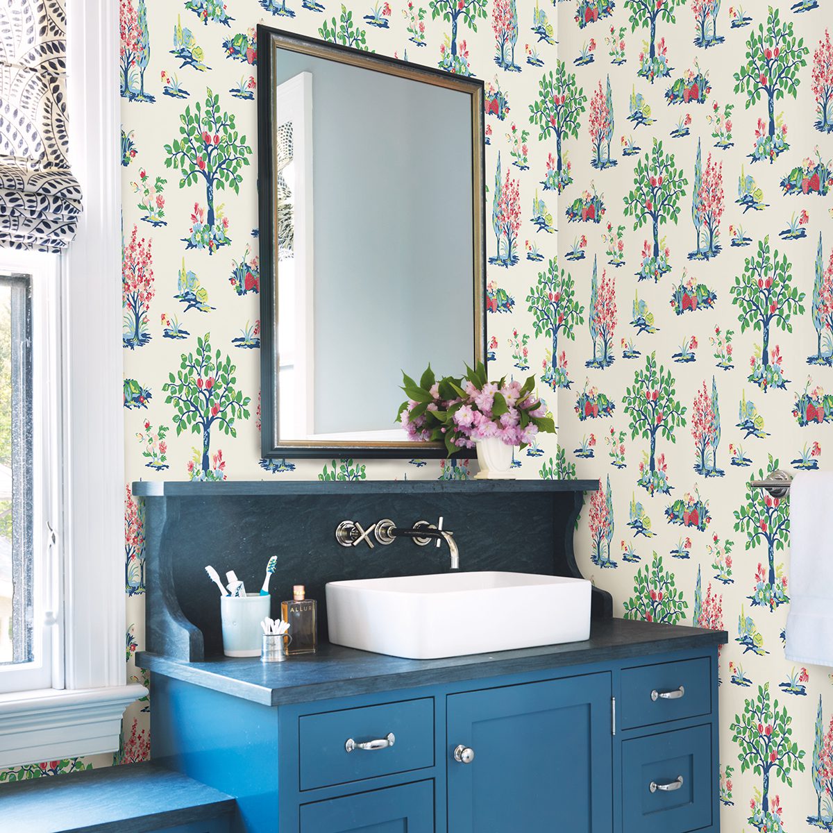 Green trees are in full bloom atop of an off-white backdrop in this Vera Bradley peel and stick wallpaper