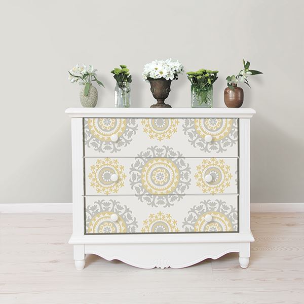 Hues of grey and yellow create a magical escape in your home. This exotic suzani printed on a premium peel and stick material that is totally removable and will not damage walls both inspires and delights! If you like the look of wallpaper but without the commitment, then this is the perfect solution for you! Style your dream home with this stunning peel and stick wallpaper.
