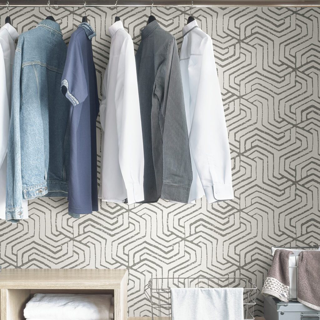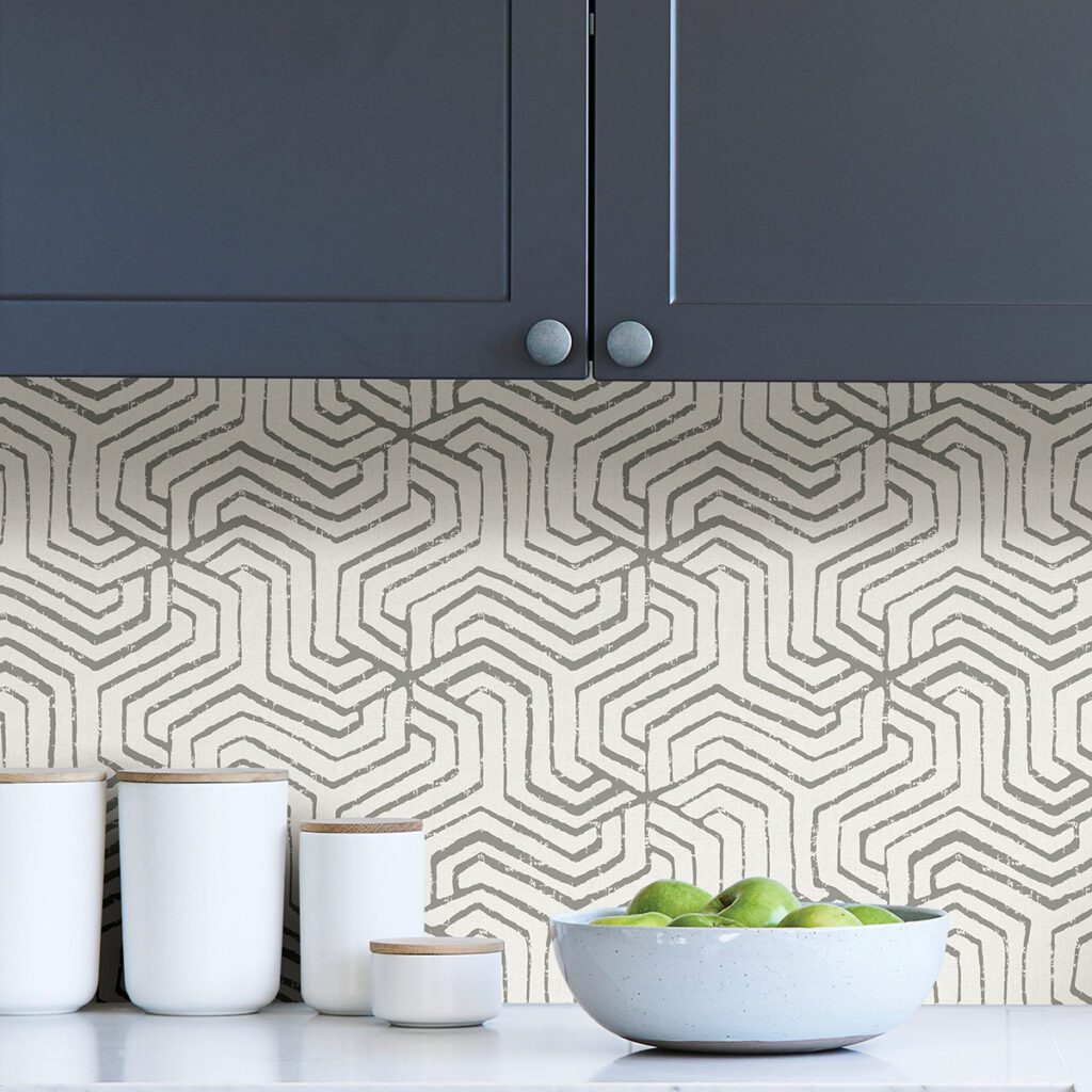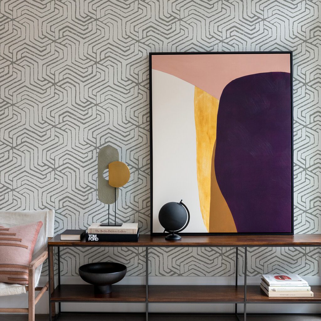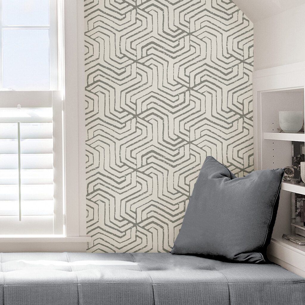 Grey and white geometric peel and stick wallpaper with a maze like pattern