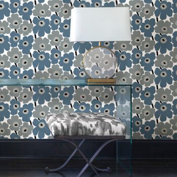 Blue and grey floral peel and stick wallpaper by Marimekko with an eclectic style