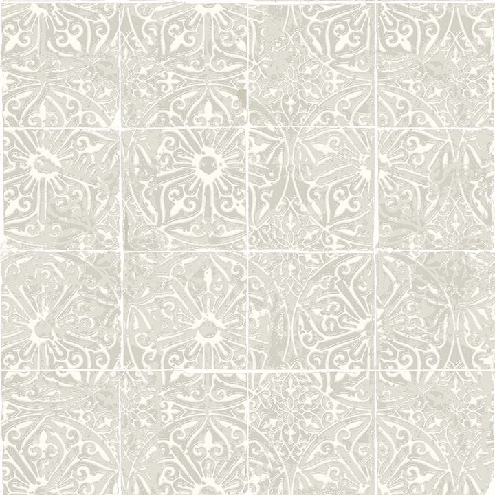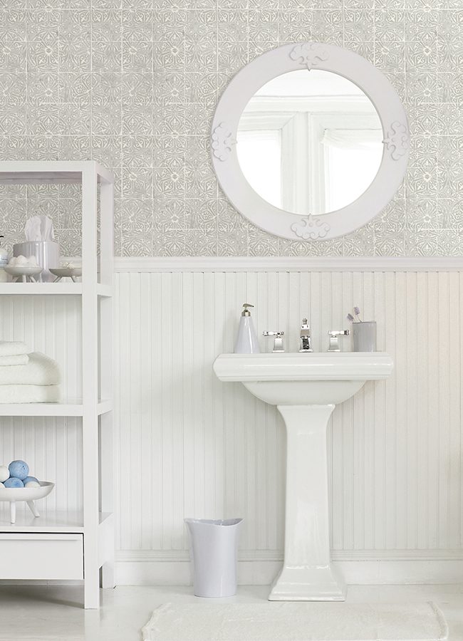 Grey and white peel and stick NuWallpaper with a floral tile pattern.