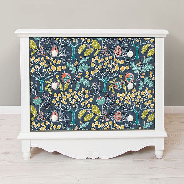 Get lost in this multicoloured woodland scene. The charming pattern features an array of vintage-style flora, including pine, pomegranate and oak trees, over a navy background.
