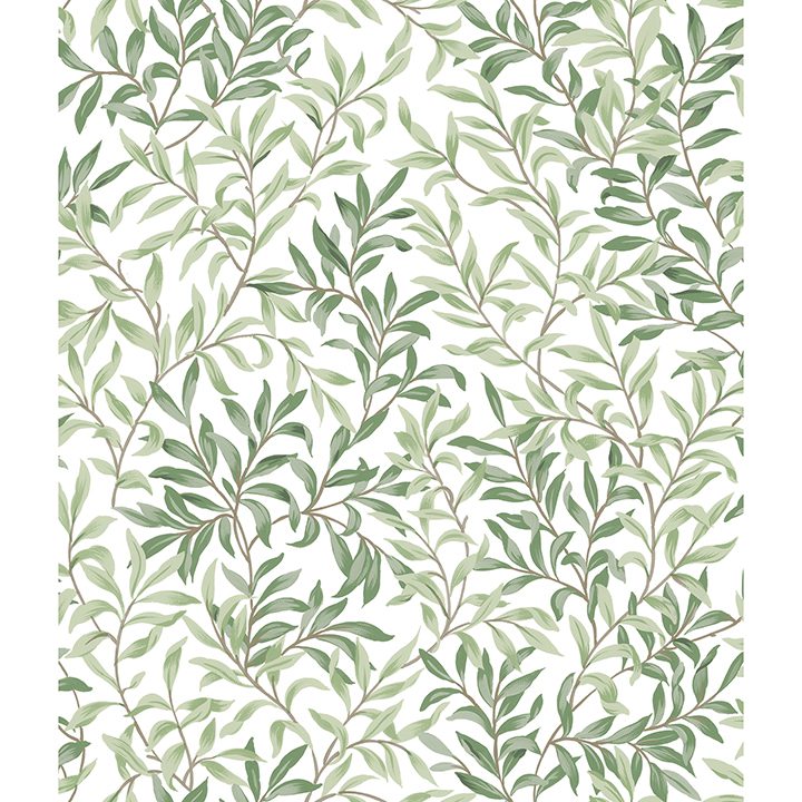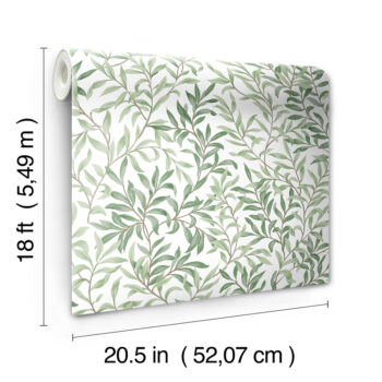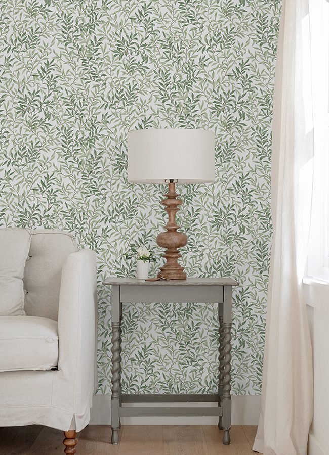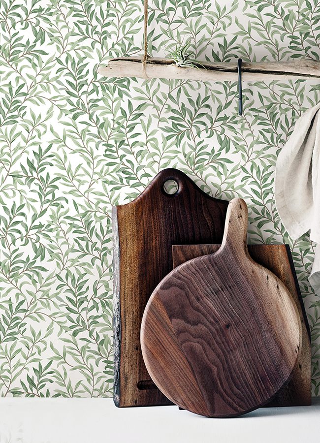 Green and white peel and stick NuWallpaper featuring vining greenery.