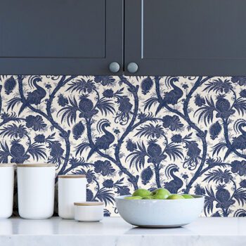 Reproduced from a 19th century French roller print, intricate floral trails feature the exotic animal among them, lending to this rich and unique pattern. Blue floral Signature Scalamandré Series peel and stick wallpaper by NuWallpaper