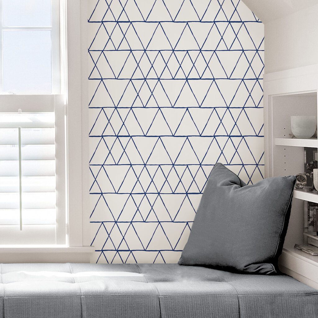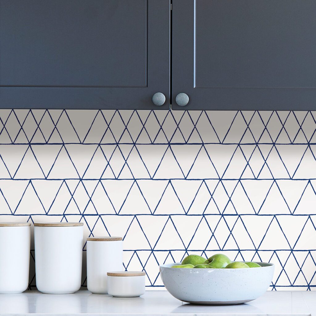 Blue and white peel and stick wallpaper with a geometric design