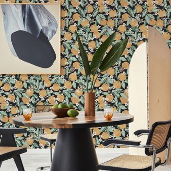 Peel and Stick NuWallpaper designed by NuWallpaper featuring a bright orange grove full of pollinators set against an inky black background.