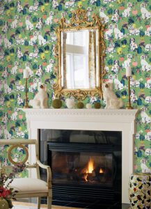 Peel and Stick NuWallpaper designed by NuWallpaper features a collection of ceramic dog statues in a green garden of potted plants.
