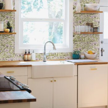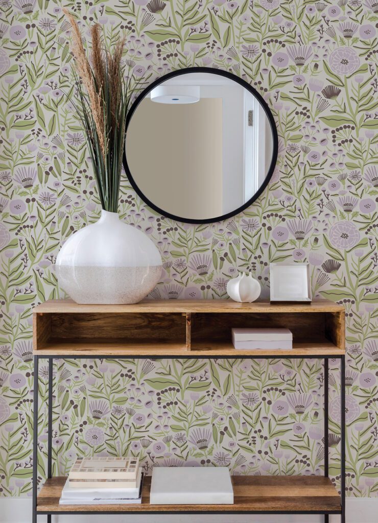 Lilac floral peel and stick wallpaper designed by Leah Duncan featuring marigolds