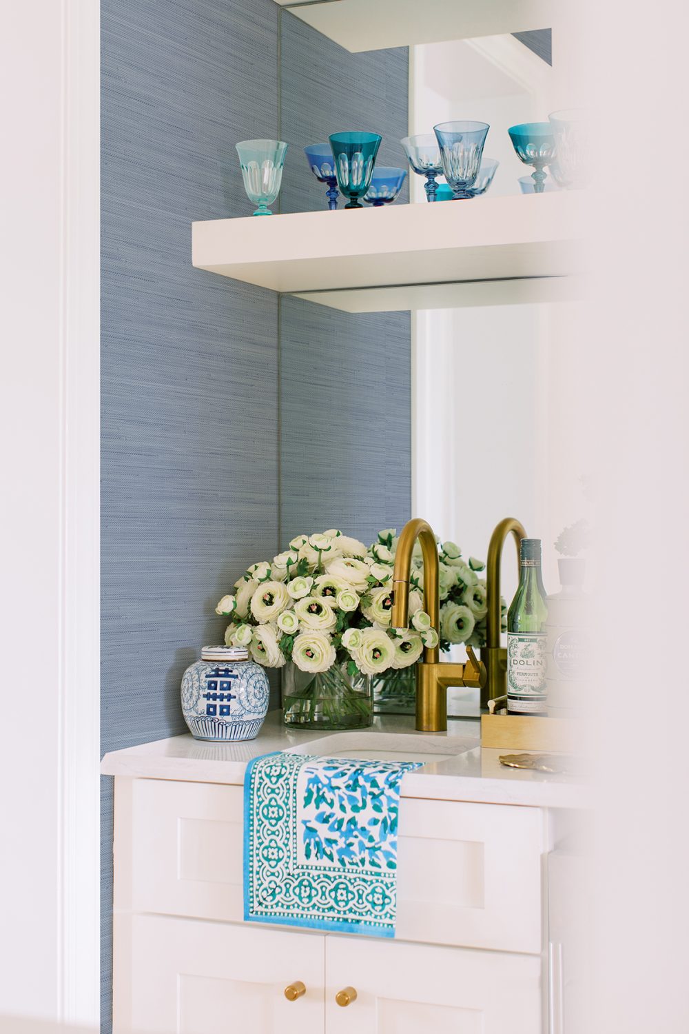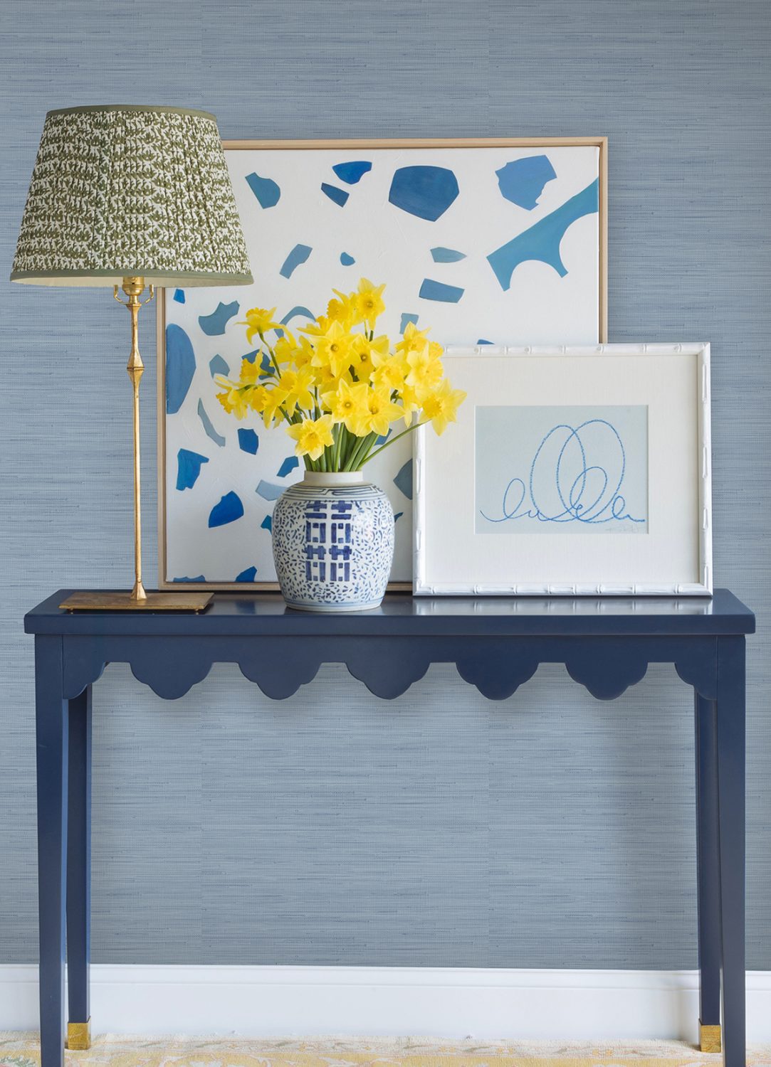 Slate blue faux grasscloth peel and stick wallpaper designed by Society Social