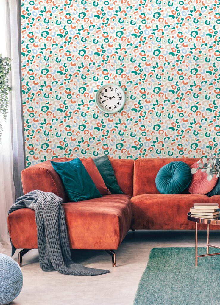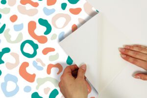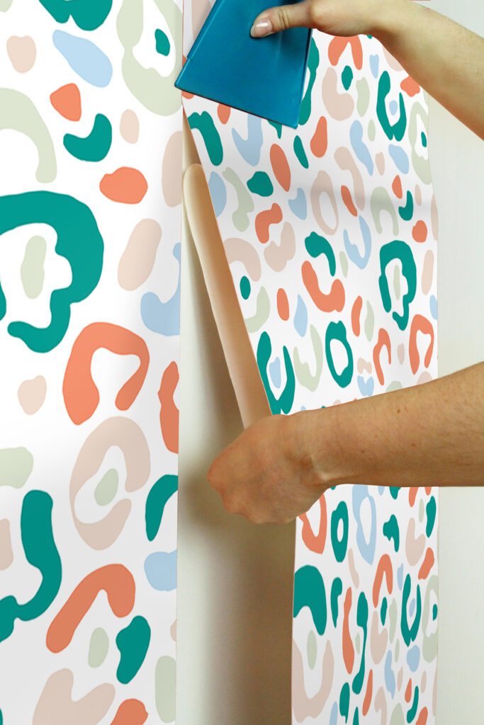 Teal, pink and green leopard spotted peel and stick NuWallpaper designed by Aelfie