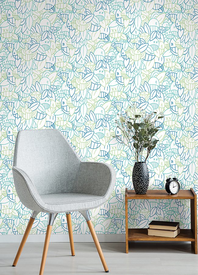 Blue and white illustrative peel and stick wallpaper by Arm of Casso featuring floral emoticon design.