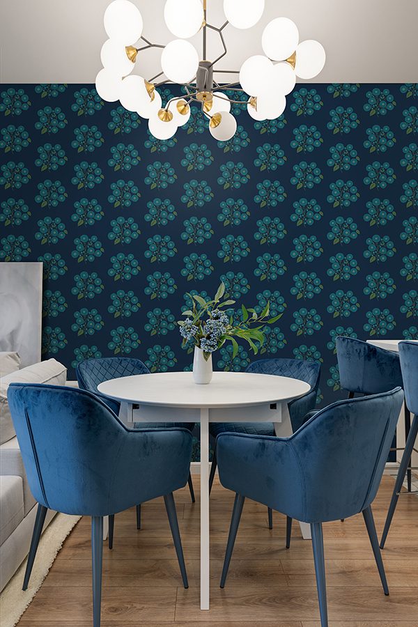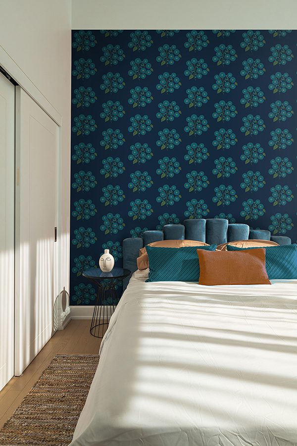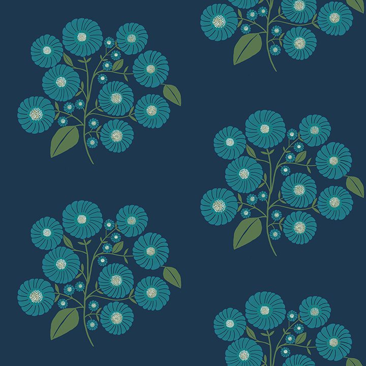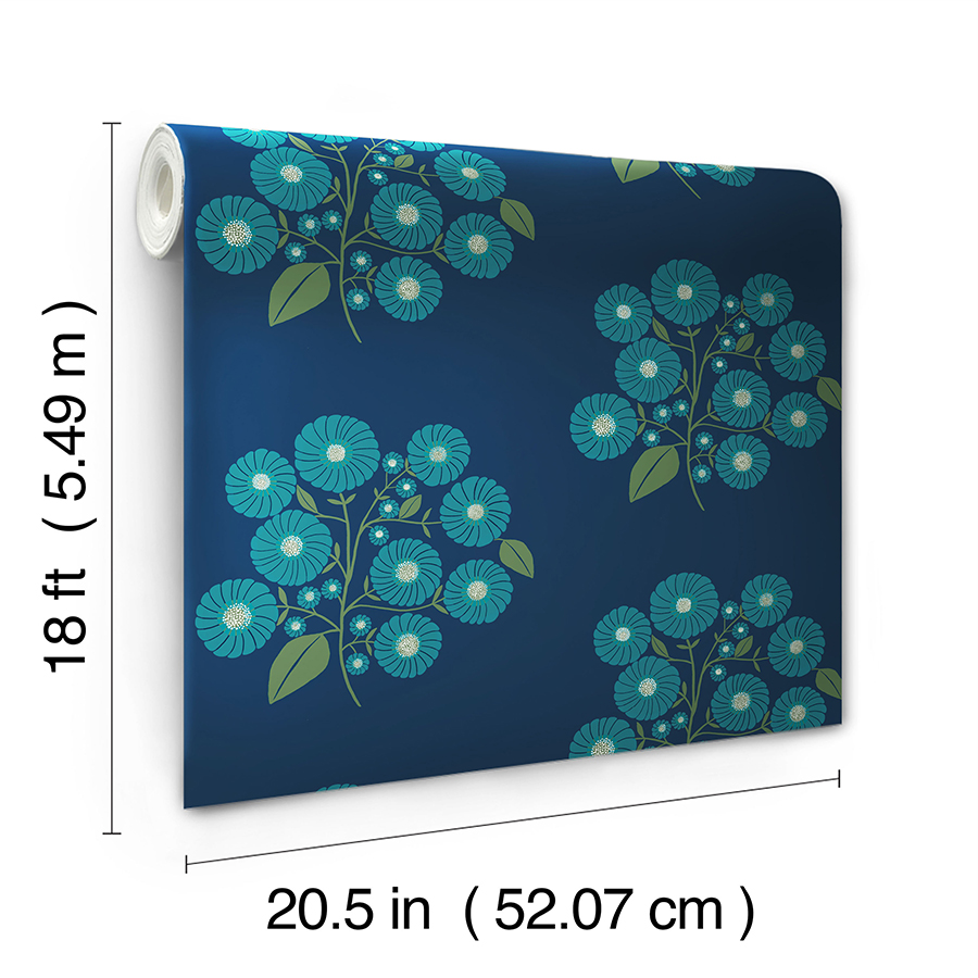 Elevate your space with this traditional design with a contemporary twist NuWallpaper print designed by Jen Hewett. Aqua strawflower bunches bloom along a navy blue backdrop.