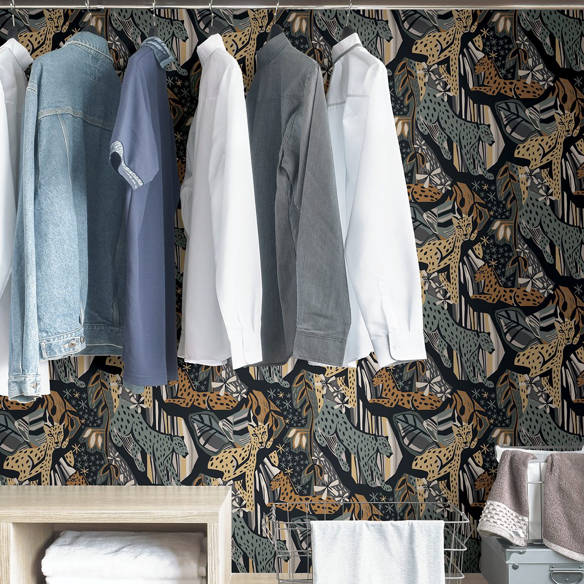 Illustrative cheetah peel and stick wallpaper bold blue and gold colour palette