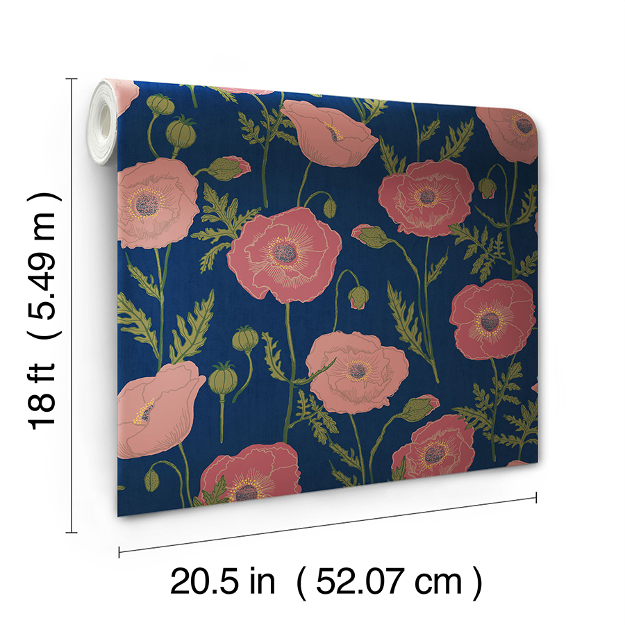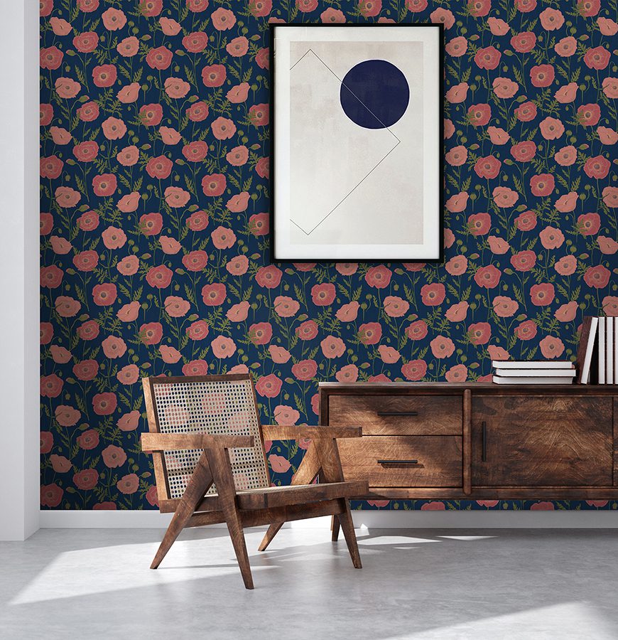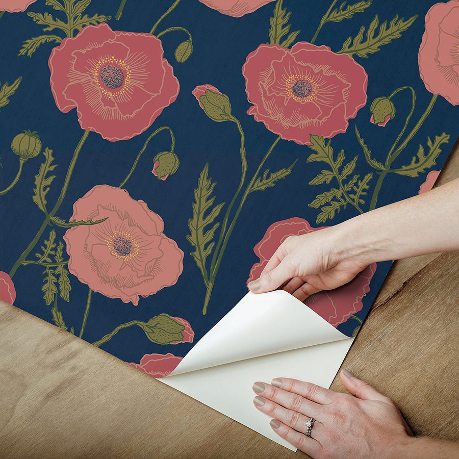 Pink and blue floral peel and stick NuWallpaper print designed by Jen Hewett