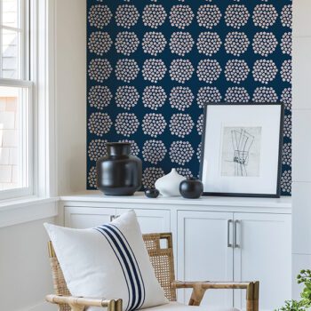 Navy and white floral peel and stick wallpaper with a geometric flair by Marimekko