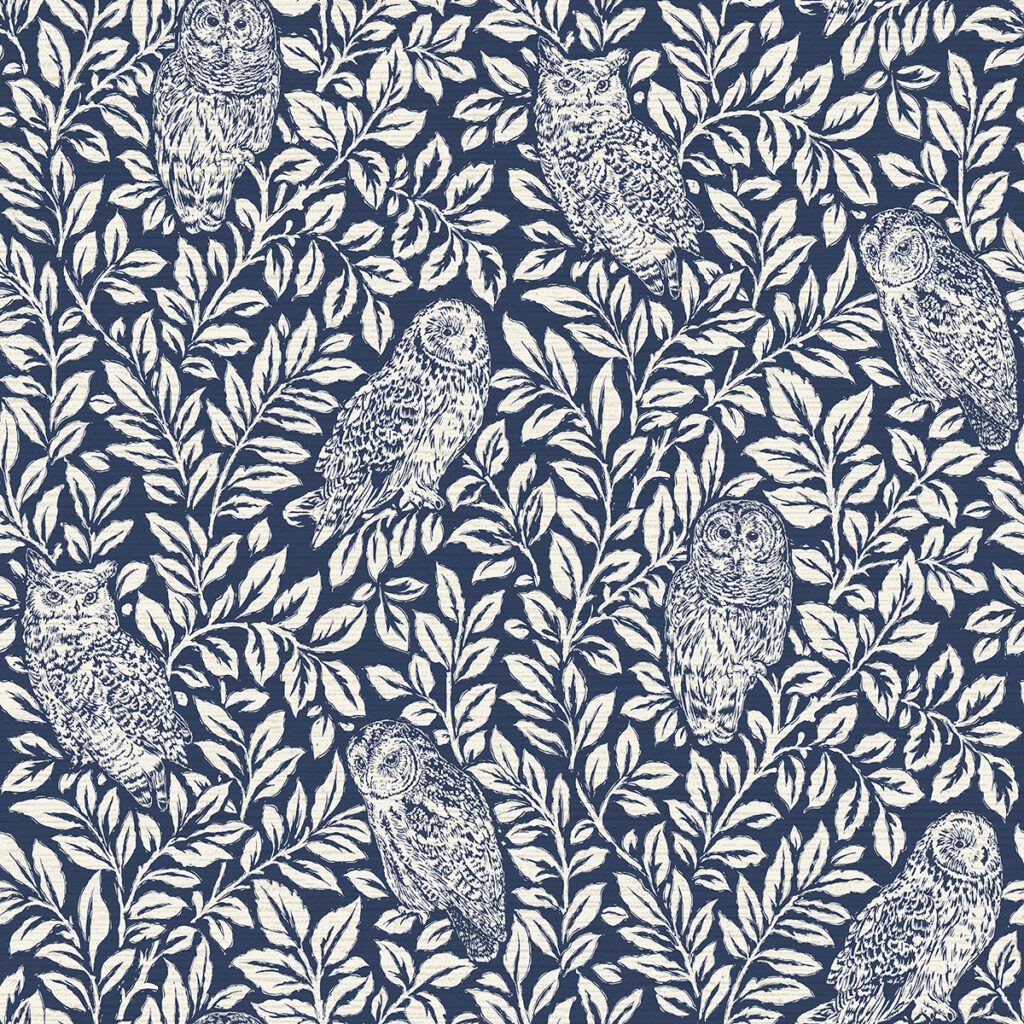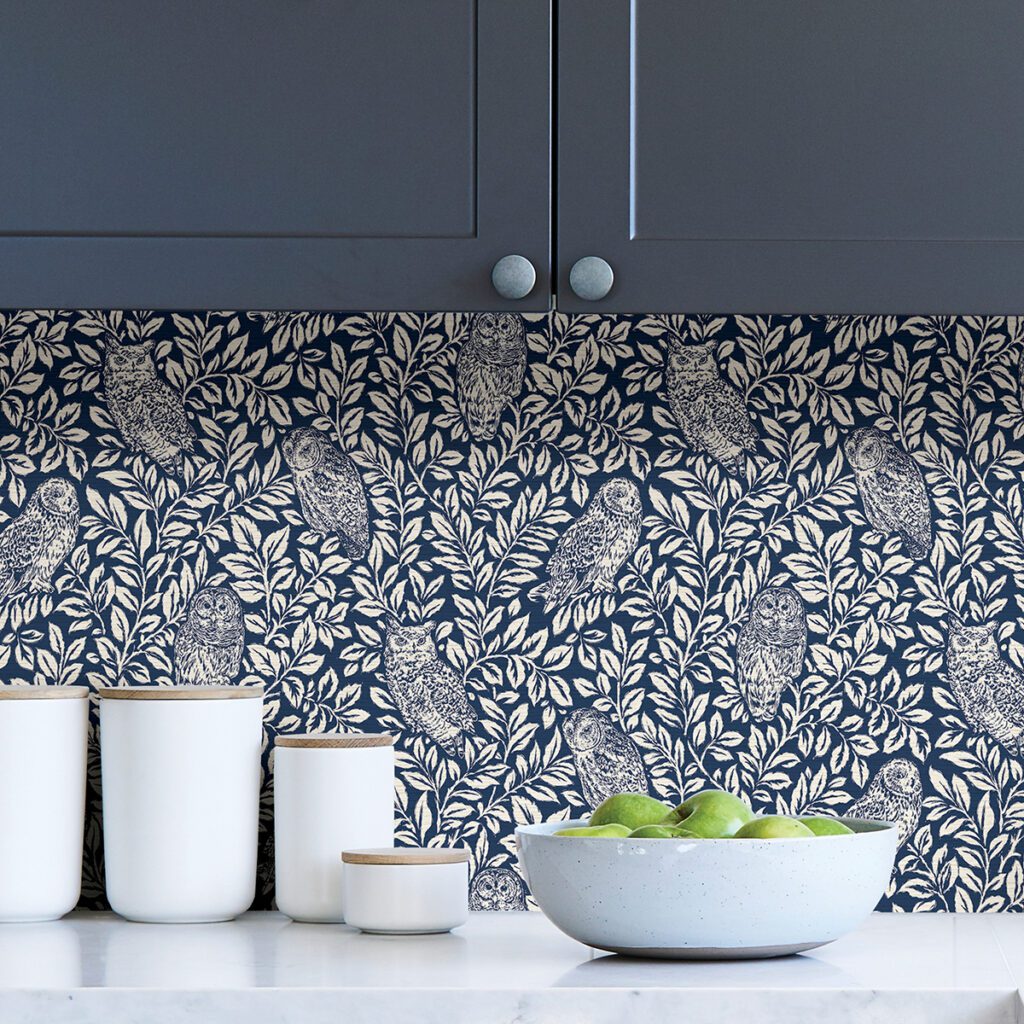 Folksy woodland themed peel and stick wallpaper with owls