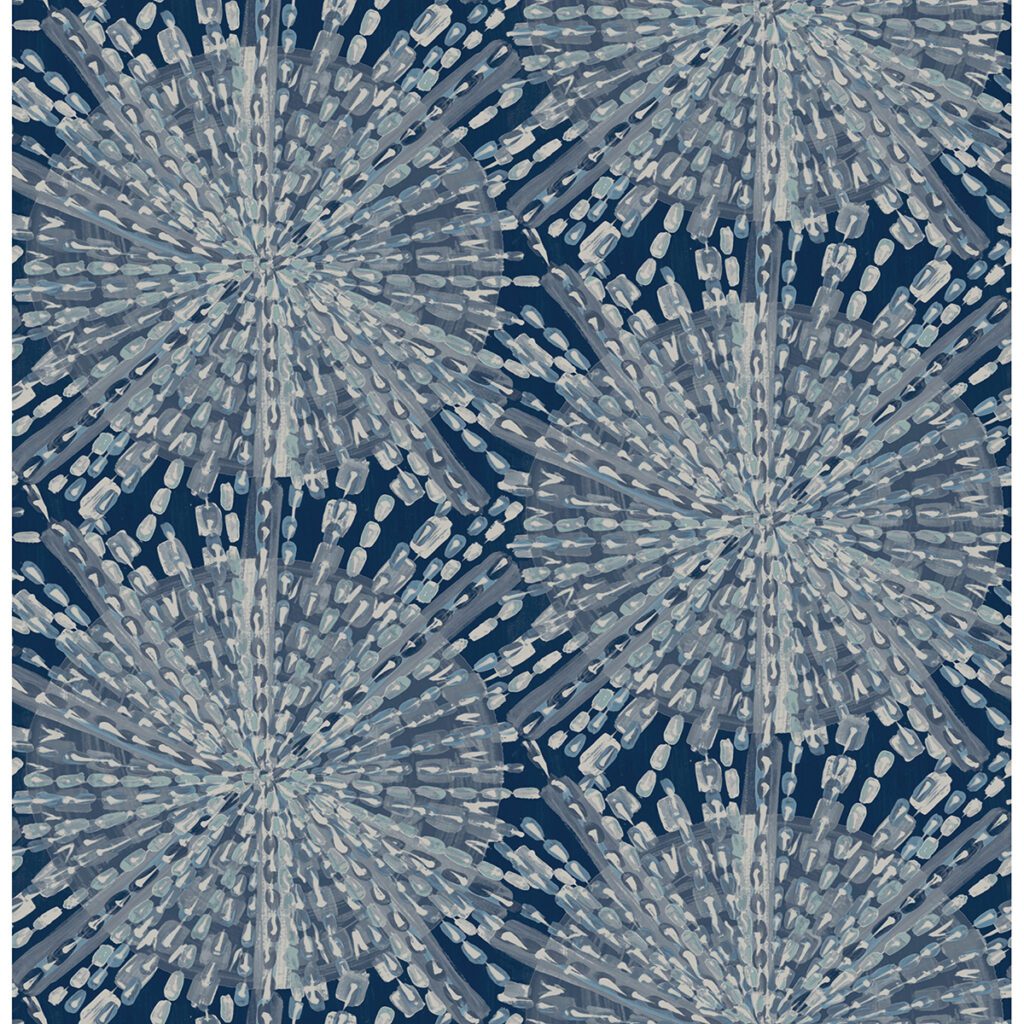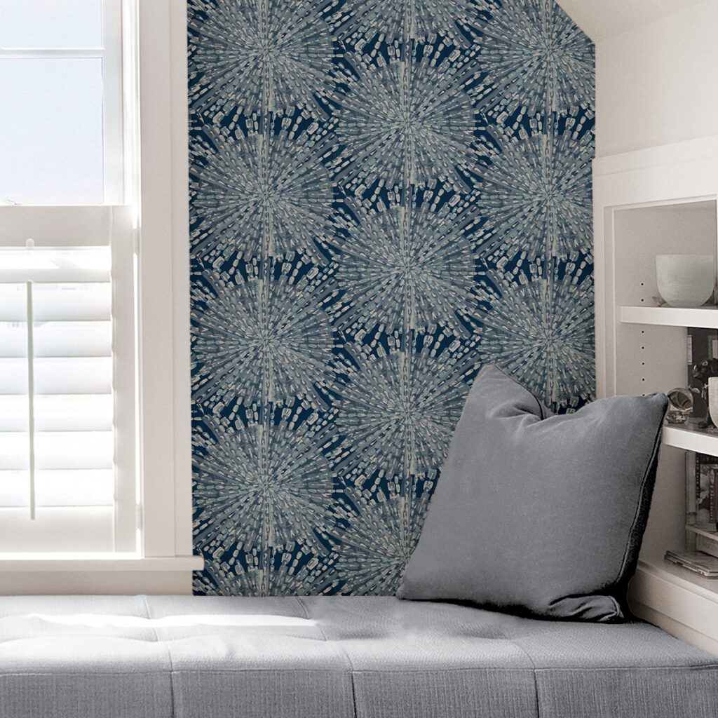 Bohemian styled peel and stick wallpaper with gold accents by Lisa Whittington