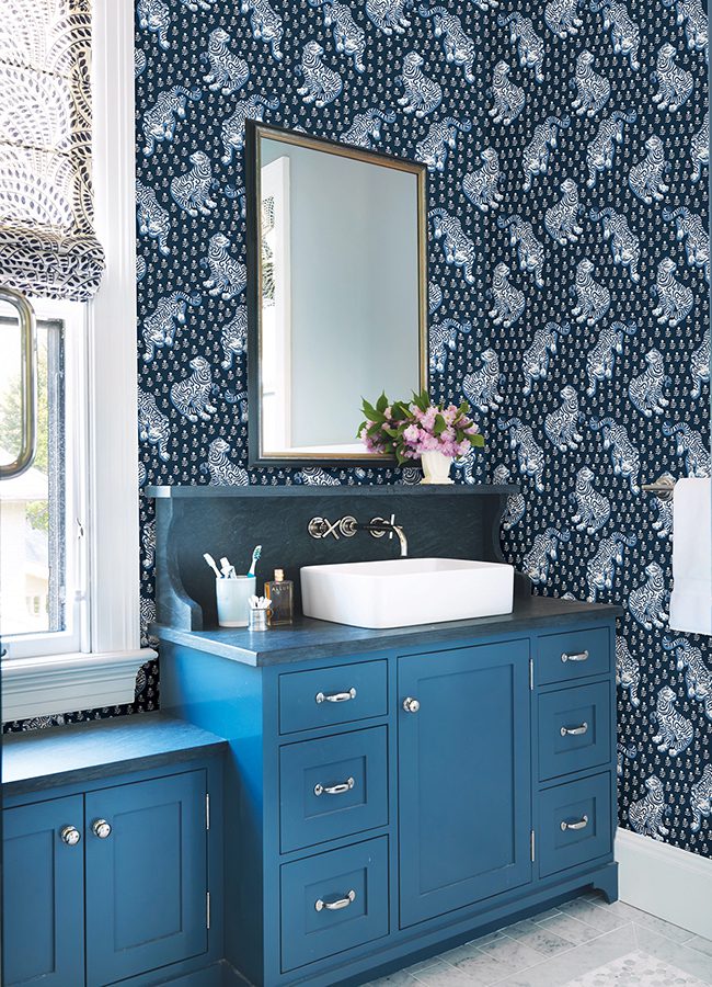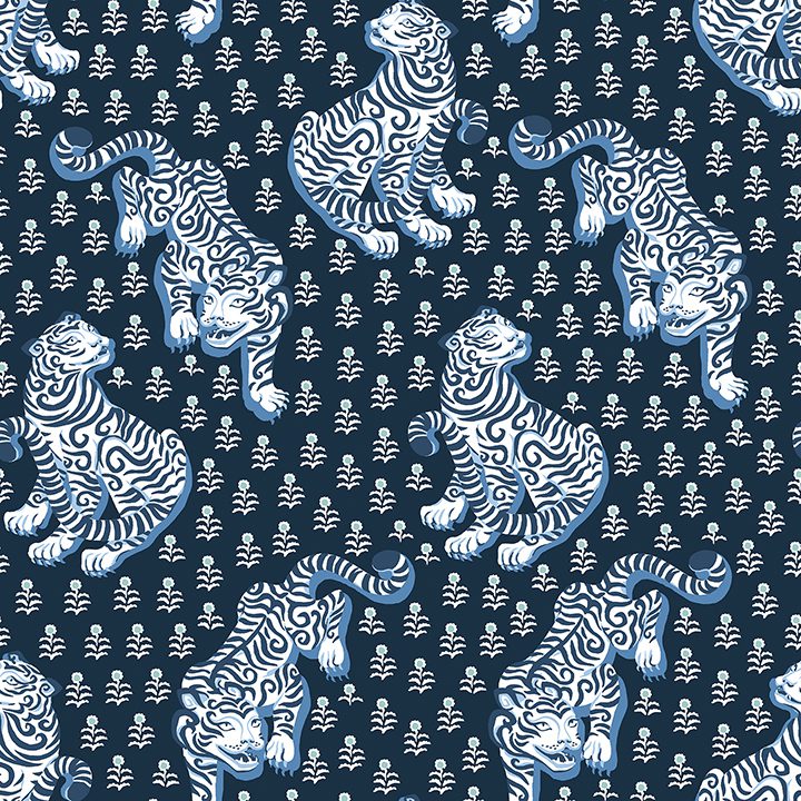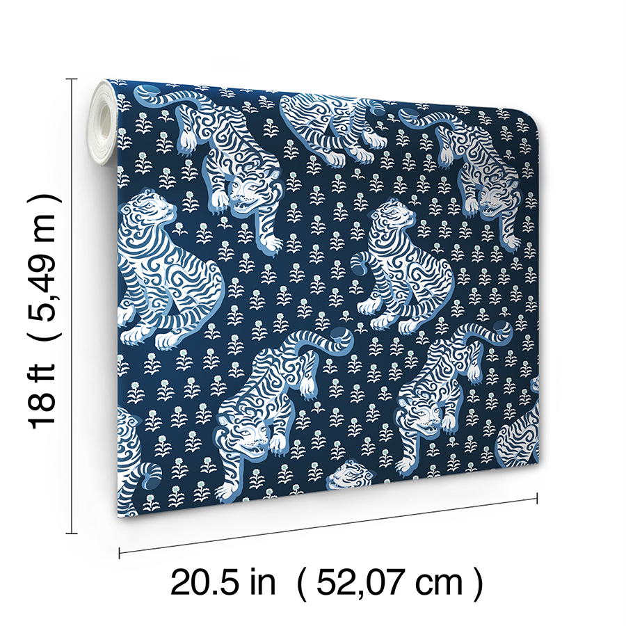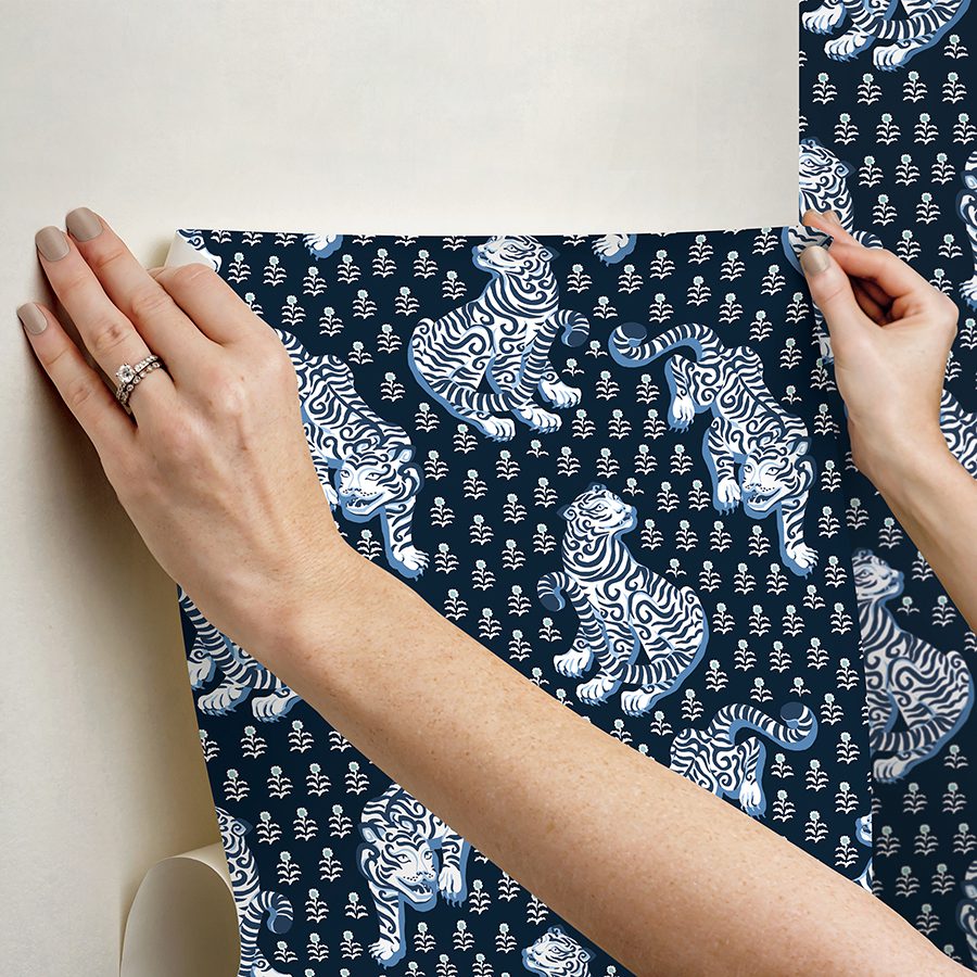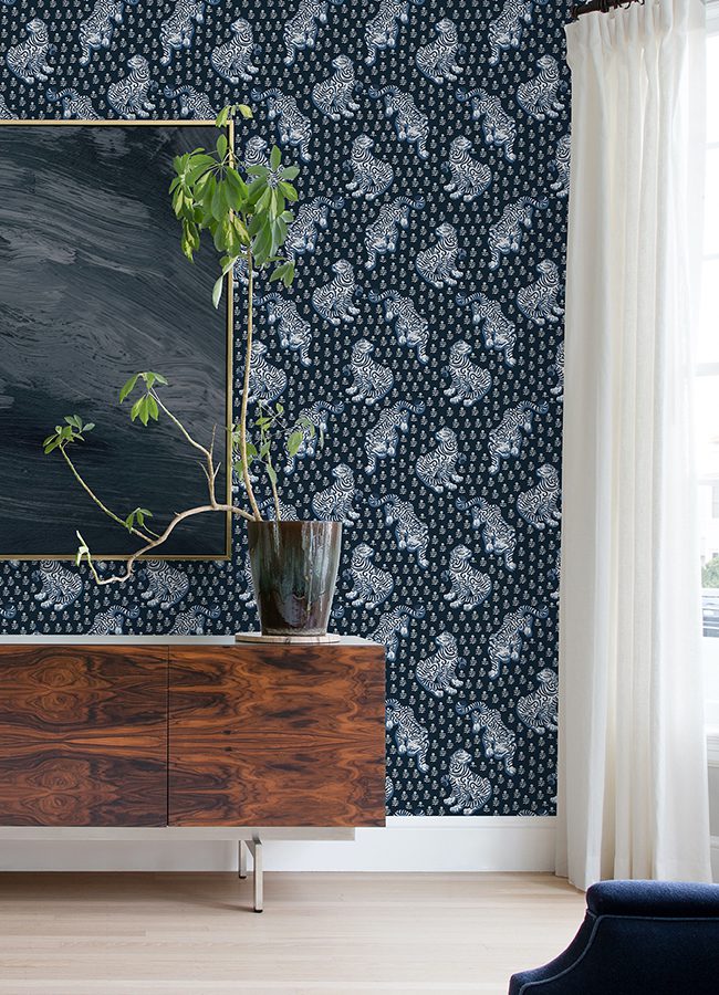 Navy blue peel and stick NuWallpaper designed by NuWallpaper featuring posing tigresses and small florals.