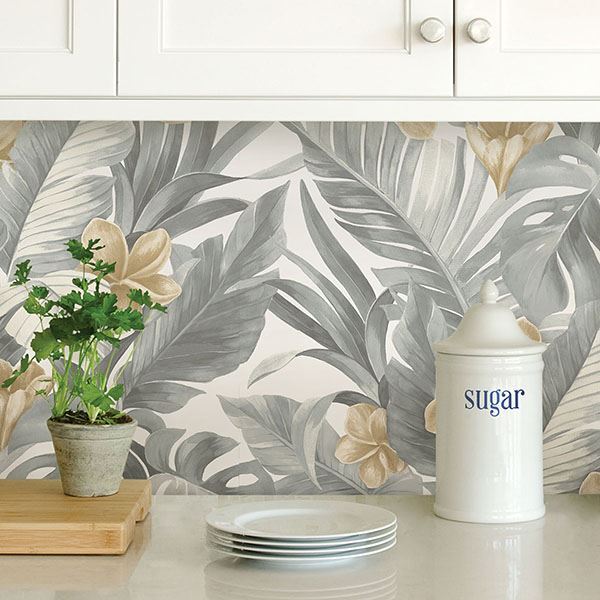Palm fronds, banana leaves, and flowers are given a neutral spin in grey and tan. This pattern is the perfect way to subtly bring tropical flair into a room.