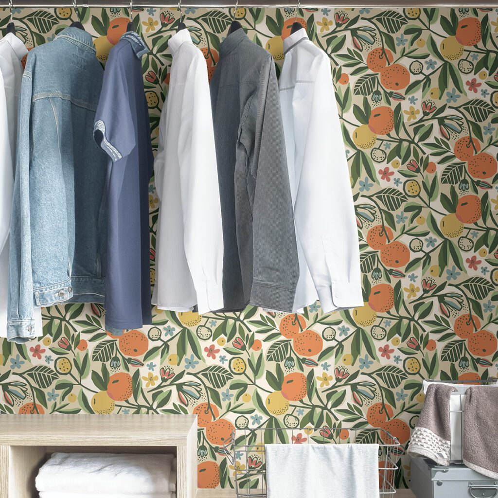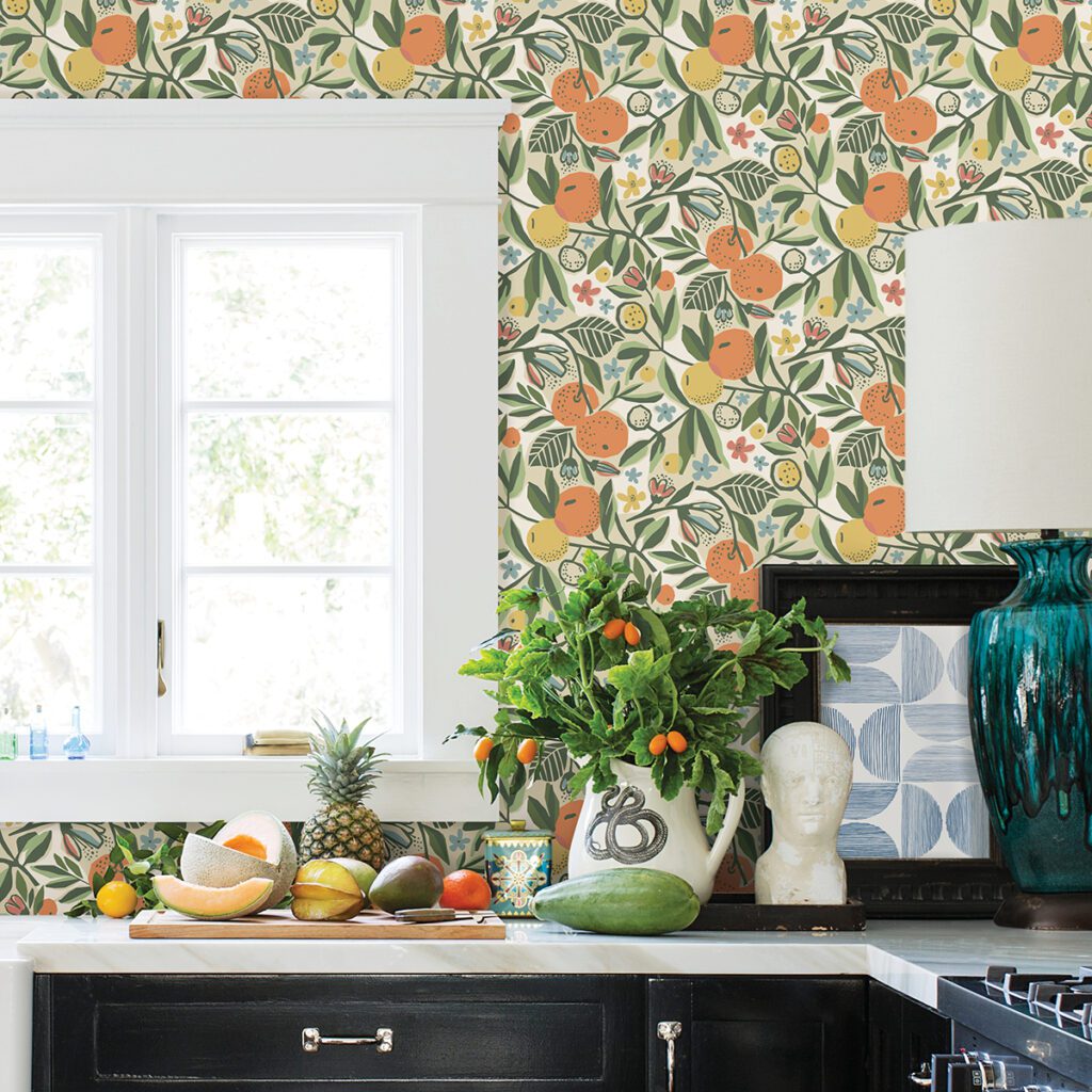 Earthy and folksy fruit peel and stick wallpaper