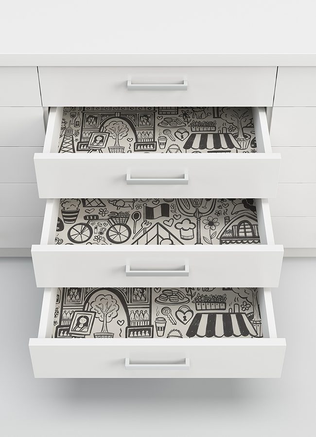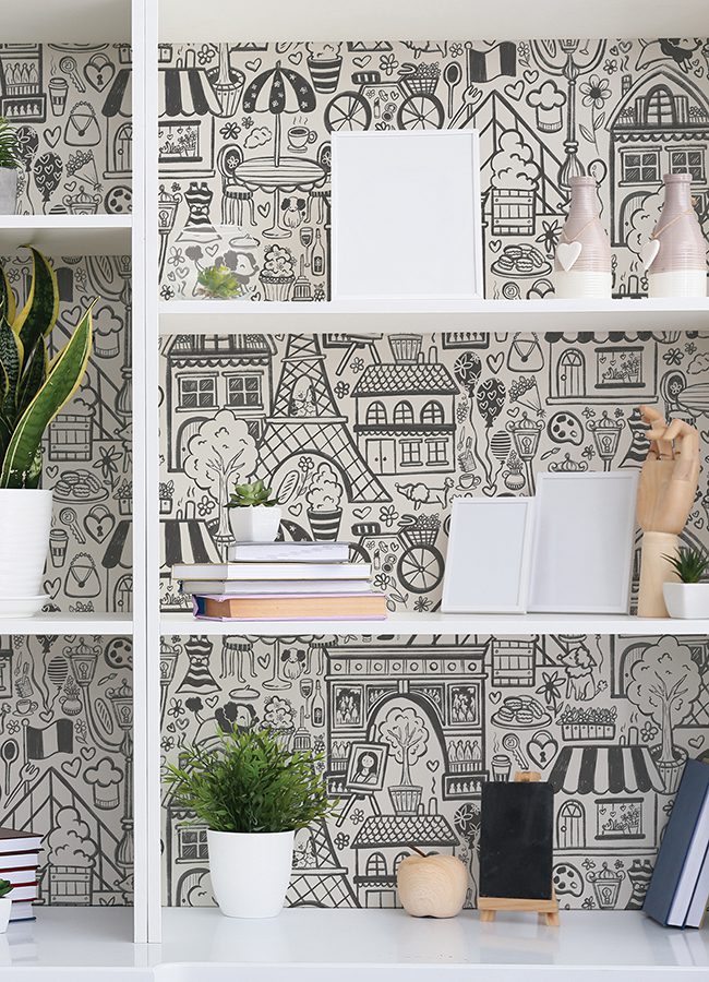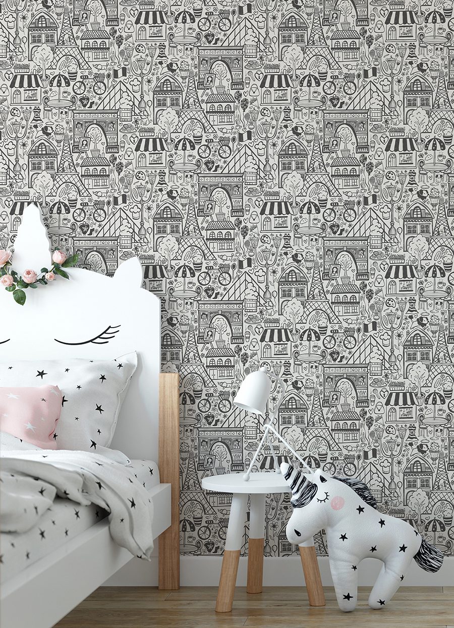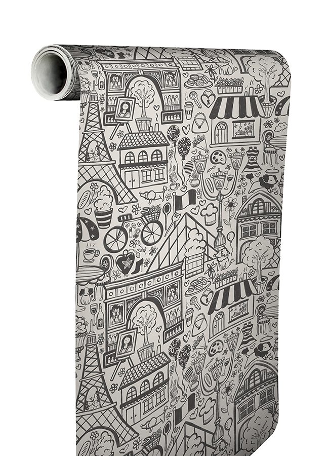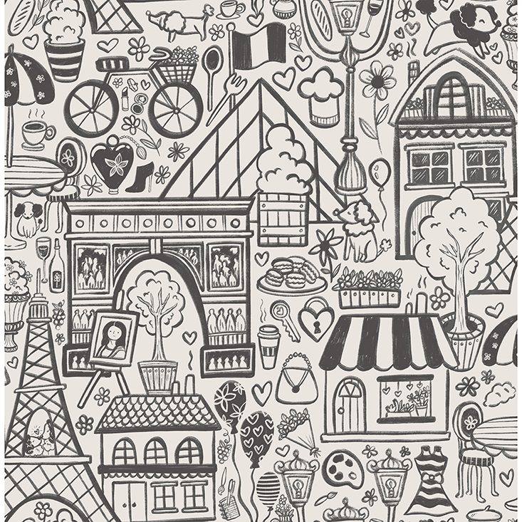 Black and white illustrative peel and stick design of Paris’s best-known cultural and architectural highlights