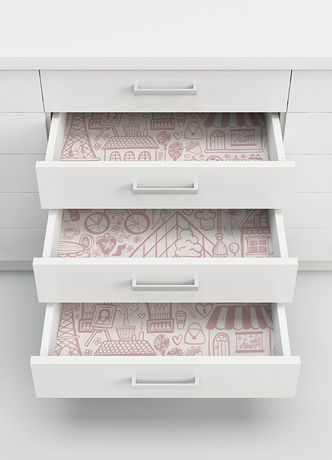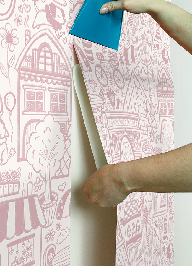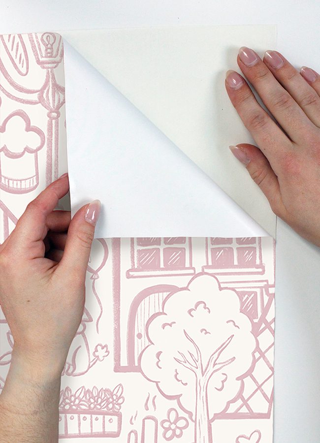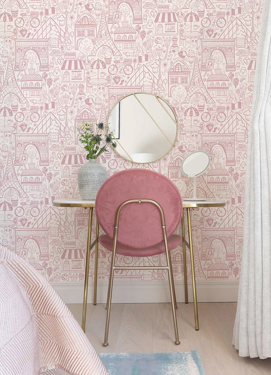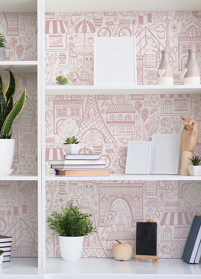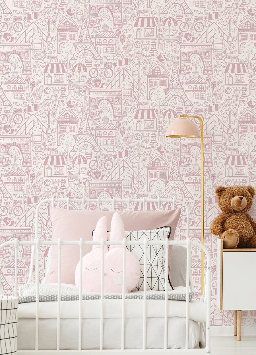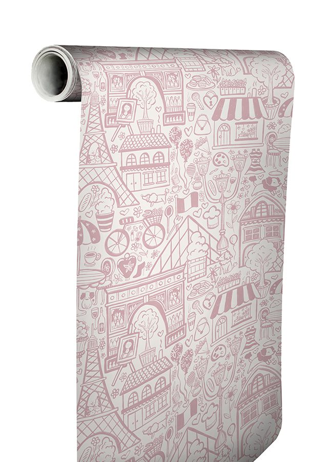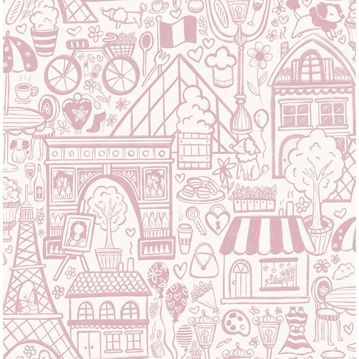 Charming, pink illustrative peel and stick wallpaper of Paris’ best-known highlights