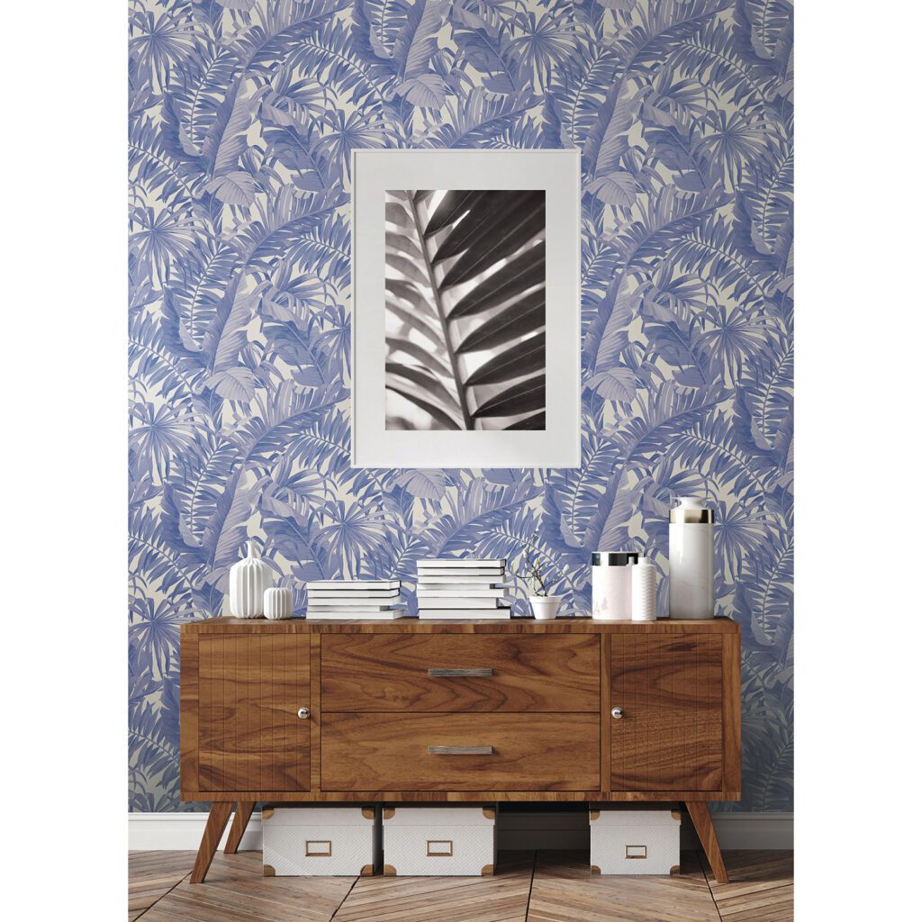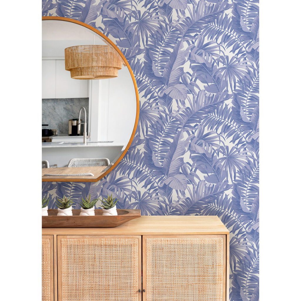 Tropical-chic palm leaf peel and stick wallpaper inspired by Pantone’s 2022 Coloured of the Year
