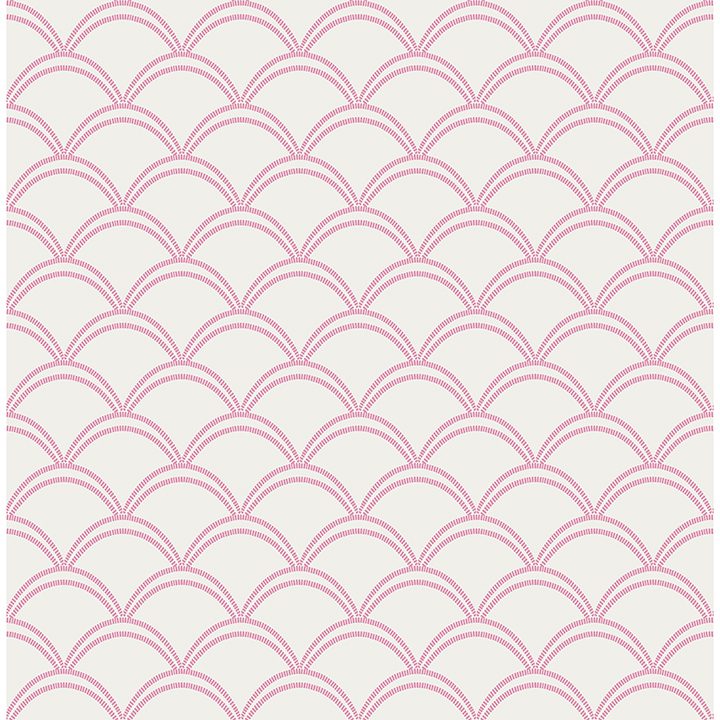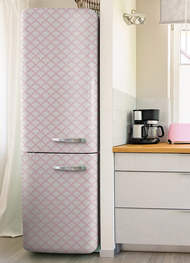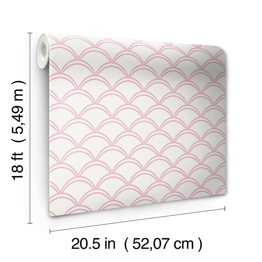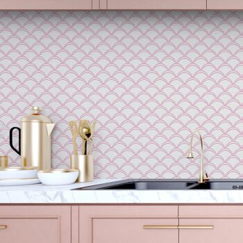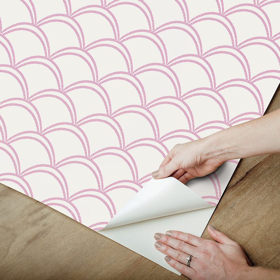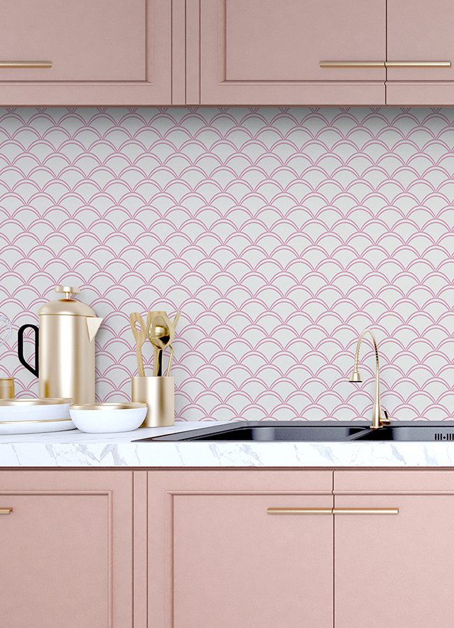 Peel and stick NuWallpaper featuring art deco scallops in pink