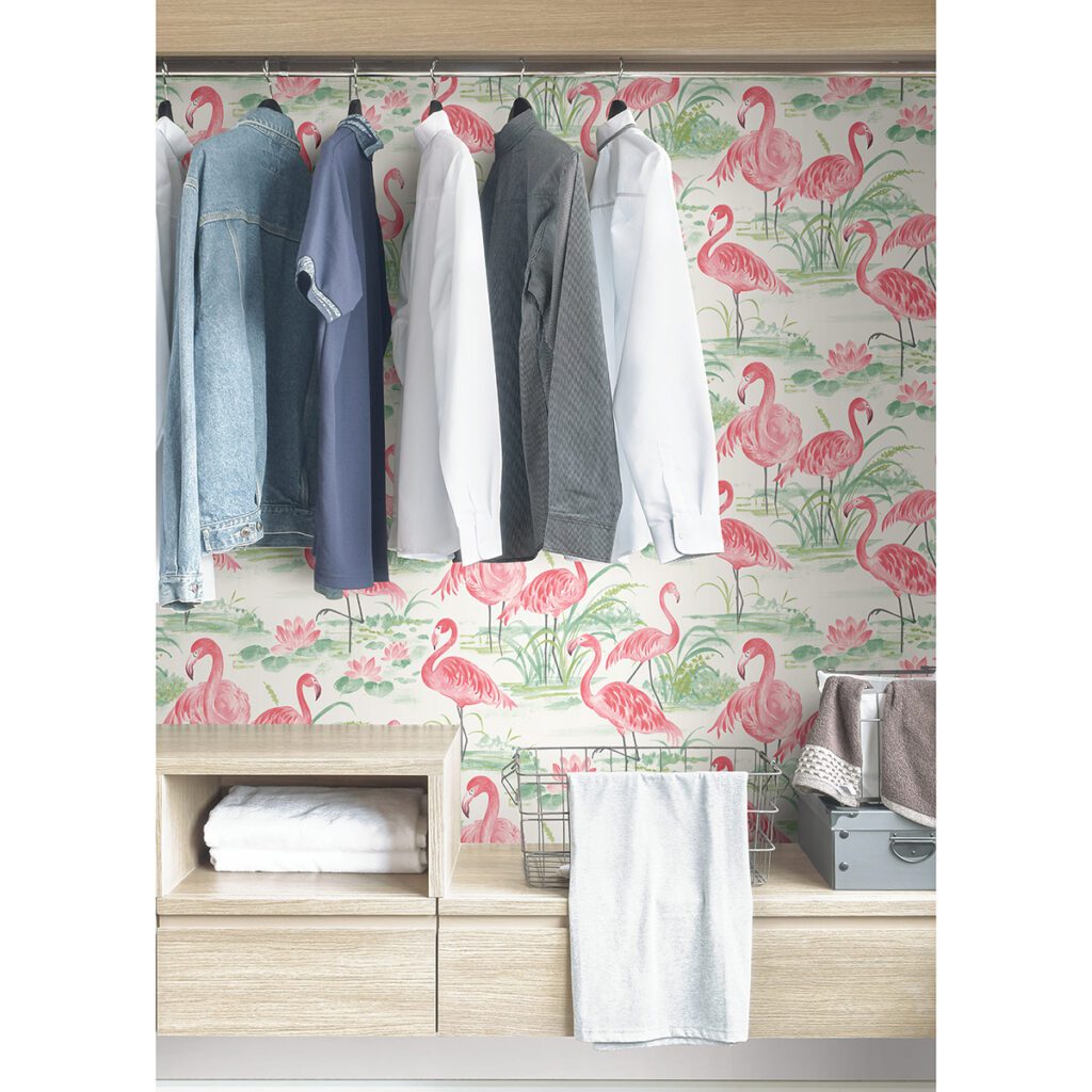 Pink flamingo and tropical theme peel and stick wallpaper