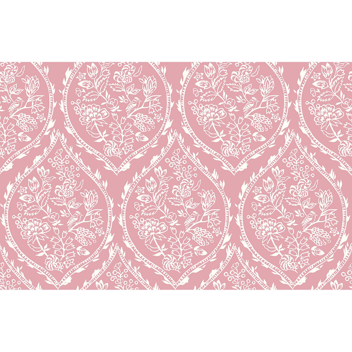 A twist on a classic, this pink and white Vera Bradley peel and stick wallpaper has a feminine and delicate energy. Floral details form the curved repeat that defines ogee patterns.