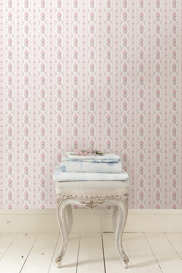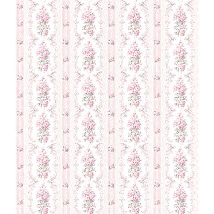 Floral stripe peel and stick wallpaper by LoveShackFancy featuring pink cabbage rose clusters and thin pink pinstripes