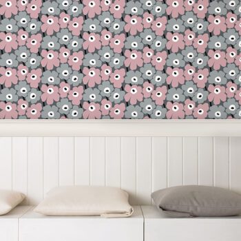 Pink and grey floral peel and stick wallpaper by Marimekko. Known for their original prints and colourful graphic designs, this floral peel and stick wallpaper is truly an iconic decor statement.