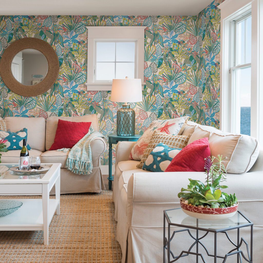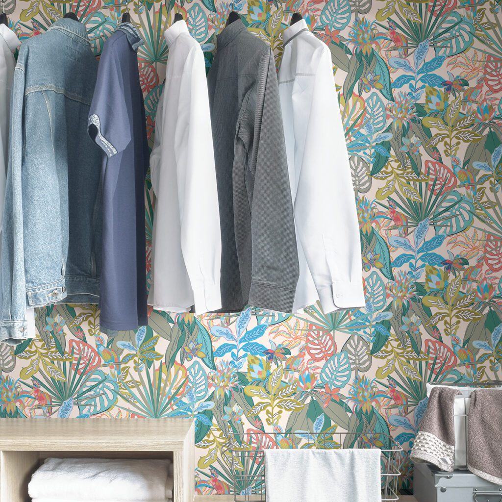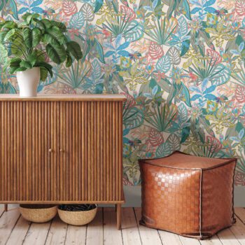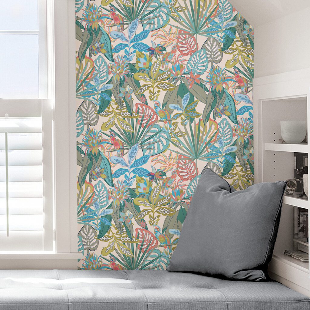 This tropical rain forest features cute cockatoos hidden amongst the foliage – perfect for styling a nursery or whimsical reading nook. Add a flourish of coloured and tropical flair with this peel and stick wallpaper by Vera Bradley