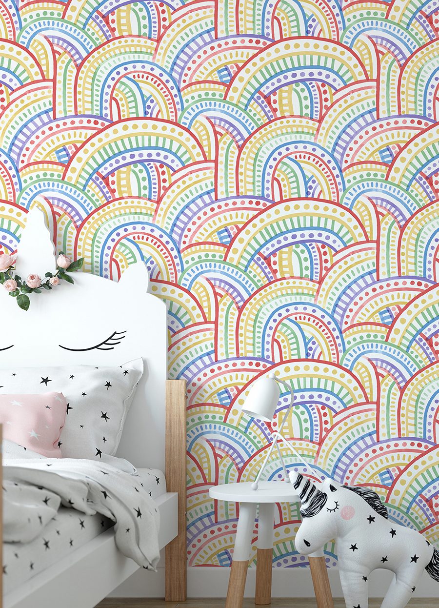 This peel and stick wallpaper offers a new take on rainbows with woven arches and geometric detailing