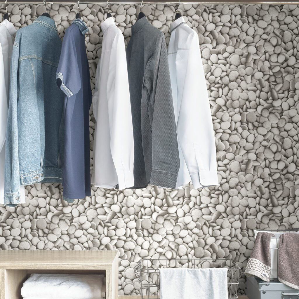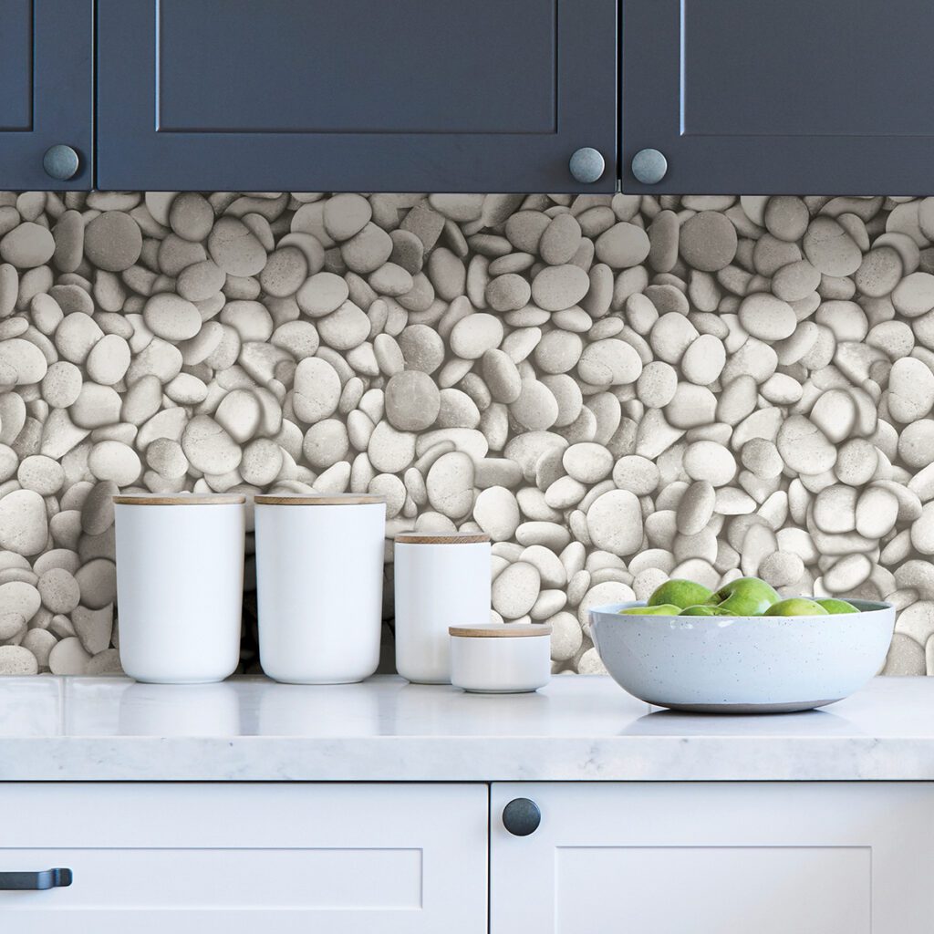 White stones peel and stick wallpaper. The neutral colour palette has a soothing feng-shui appeal.