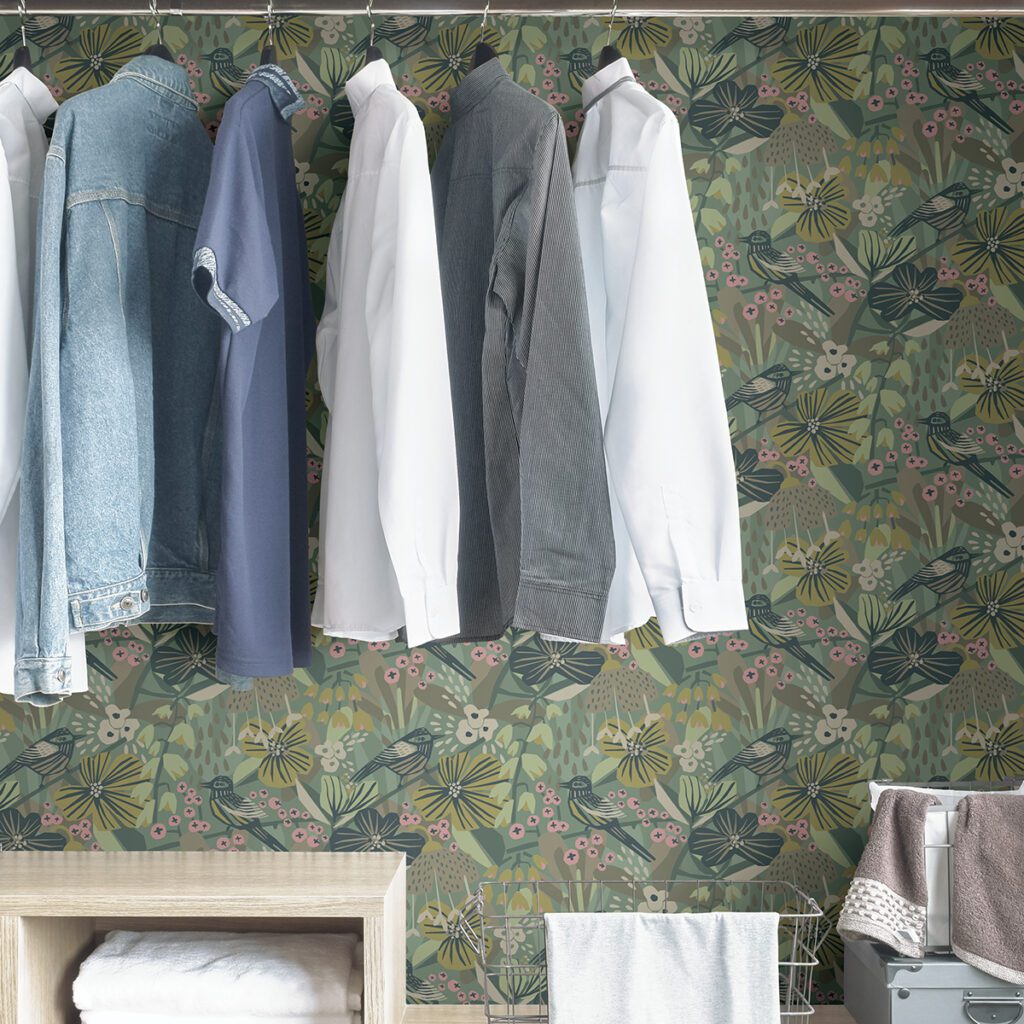 Green and pink floral and bird peel and stick wallpaper