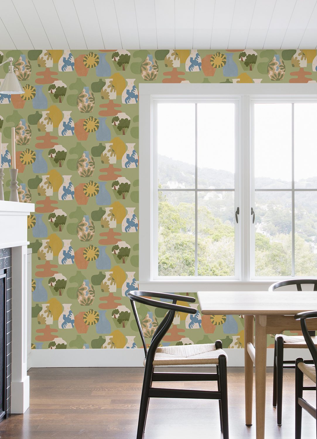 Green peel and stick wallpaper abstract vase design; artwork by Alja Horvat.