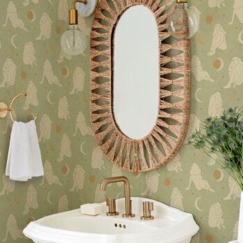 Sage green peel and stick wallpaper featuring feminine silhouettes and celestial bodies; designed by Alja Horvat.