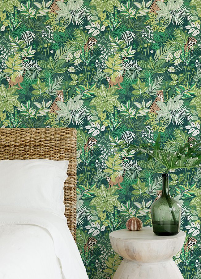 Peel and Stick NuWallpaper designed by NuWallpaper featuring a lush green jungle scene with cheetahs, lemurs, and tigers.