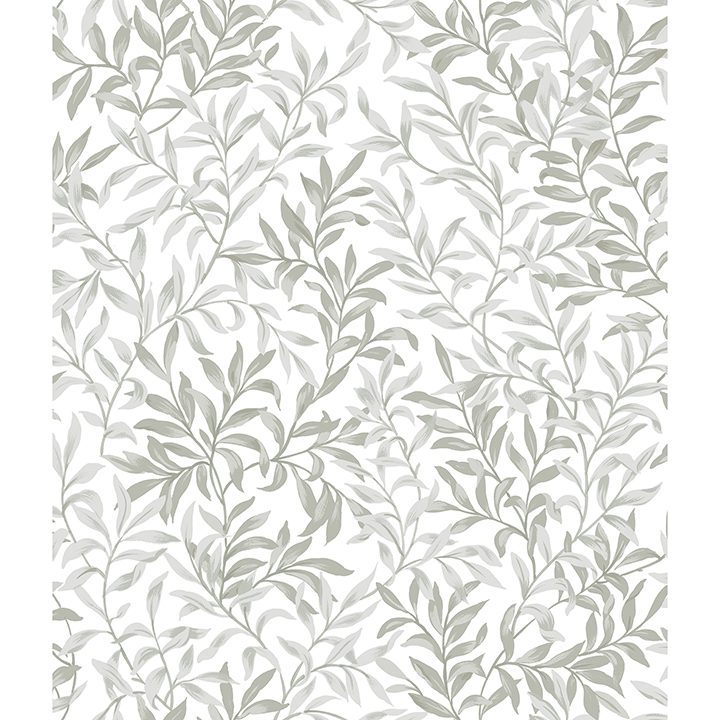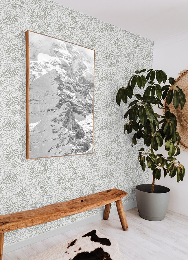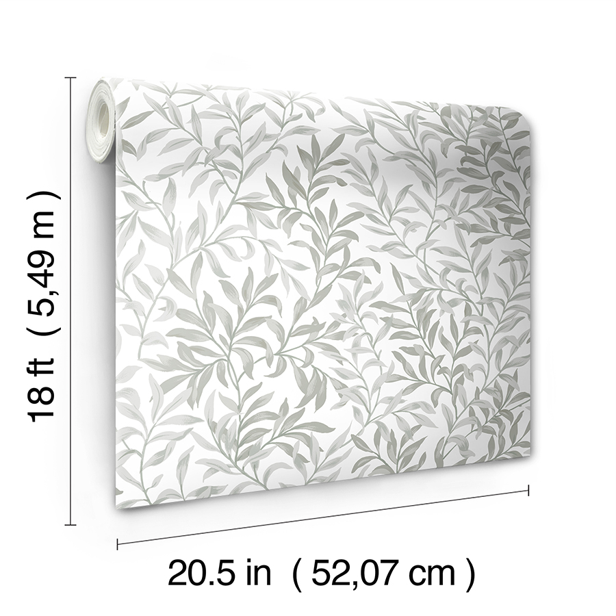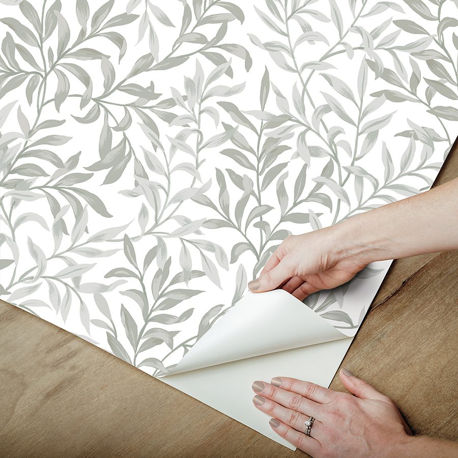 White and grey peel and stick NuWallpaper featuring vining greenery.