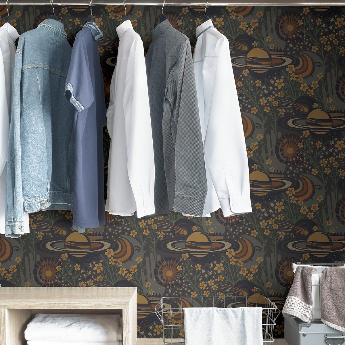 Sun, moon, and stars peel and stick wallpaper with flowers