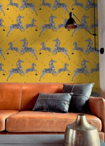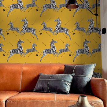 The iconic Zebra Safari print by Scalamandré on yellow self adhesive wallpaper.