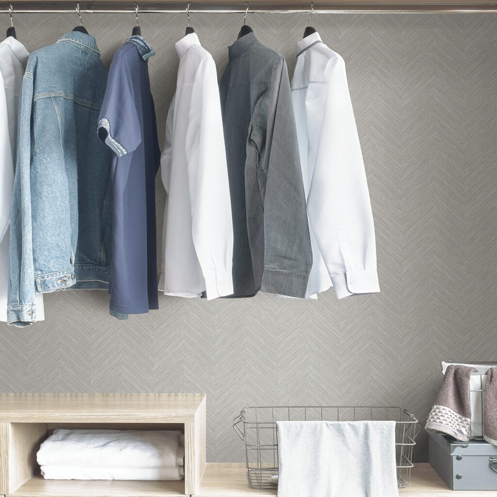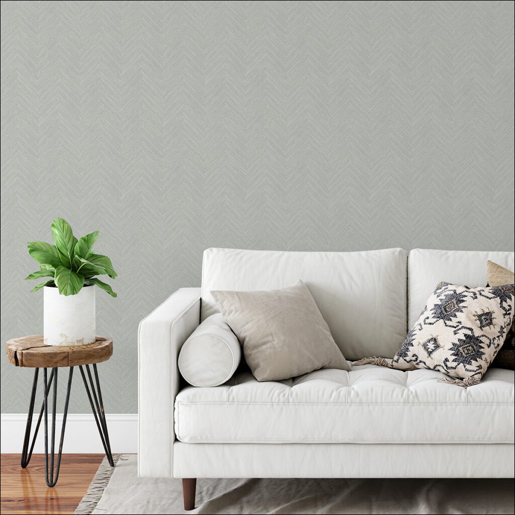 Grey linen inspired peel and stick wallpaper in a chevron pattern