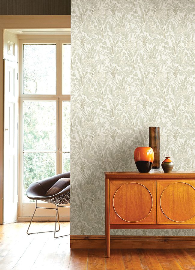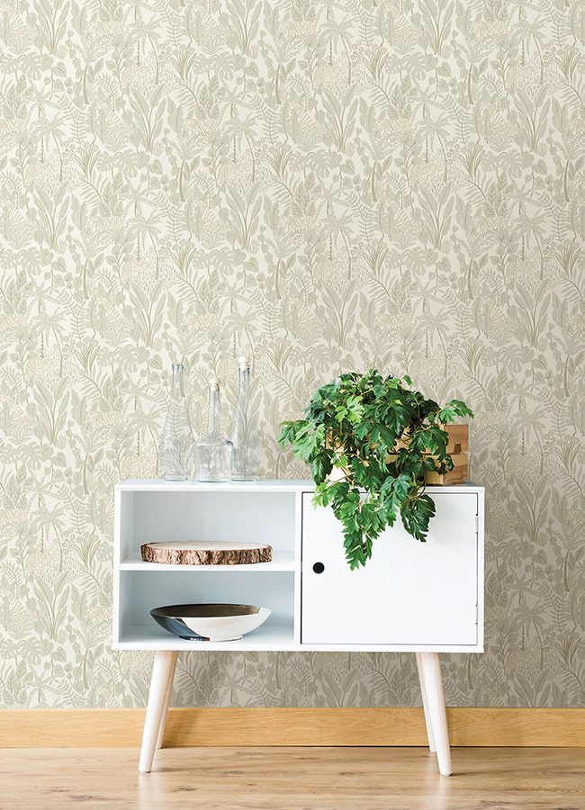 Neutral peel and stick wallpaper with a jungle-inspired theme