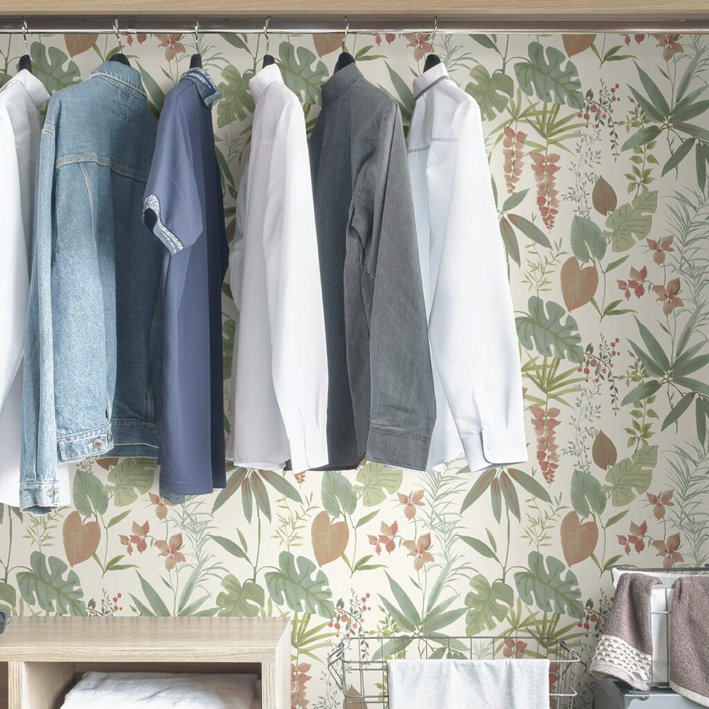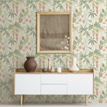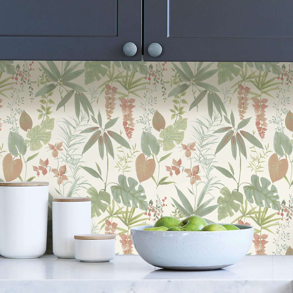 Tropical ferns are bathed in a variety of neutral shades and muted green hues, lending to their bohemian flair. peel and stick wallpaper