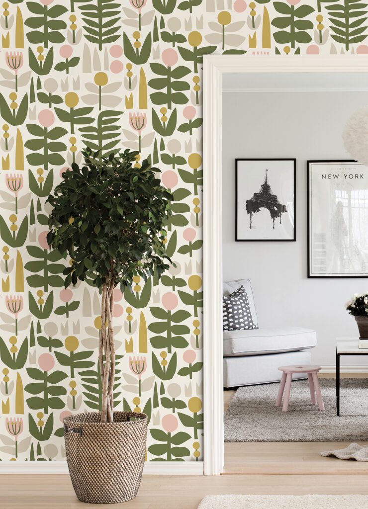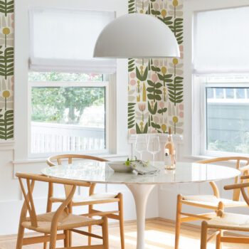 Pink and green floral peel and stick wallpaper designed by Leah Duncan