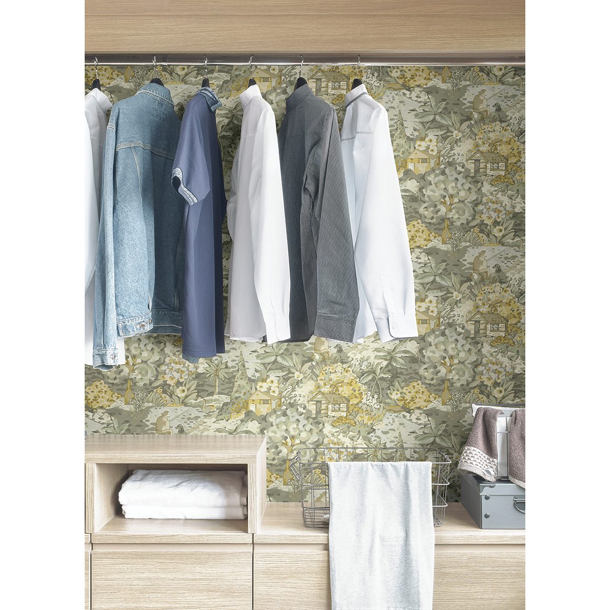 In a calming coloured palette of grey and yellow hues, Caroline et Bettina’s peel and stick wallpaper invites you to explore the lakeside. What critters will you find?