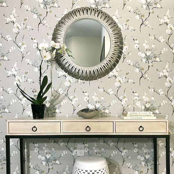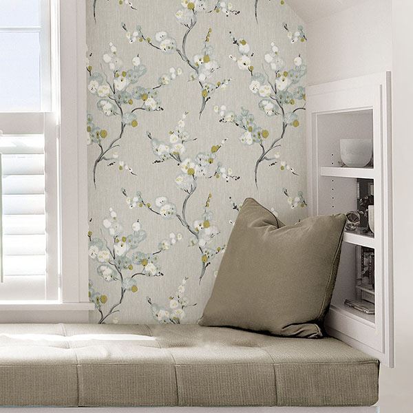 Inspired by Japanese blossoms, this floral pattern has a timeless elegance. The blue, yellow, and white flowers sprawl over a grey linen print background.