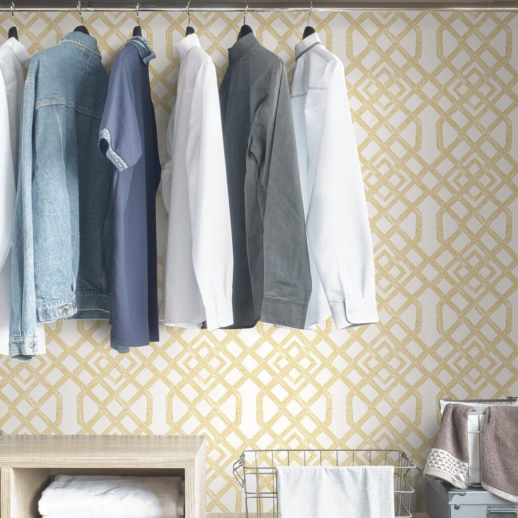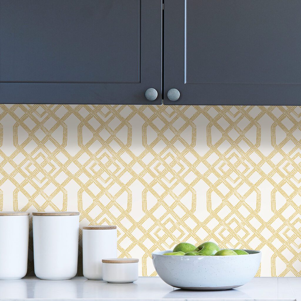 Yellow and white peel and stick wallpaper featuring a woven trellis