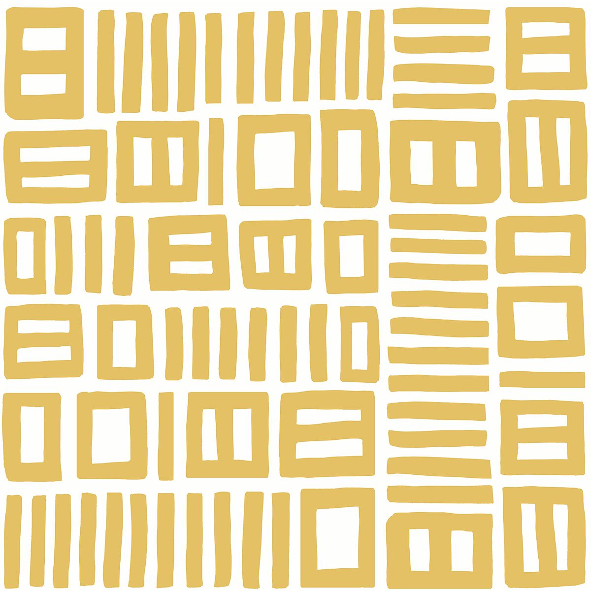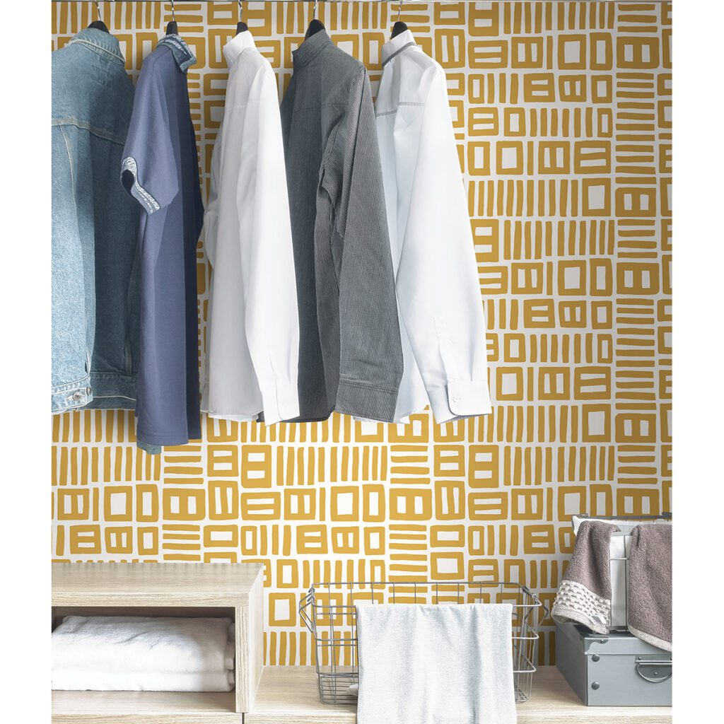 Yellow and white hand painted peel and stick wallpaper by Hadiya Williams with a bohemian flair